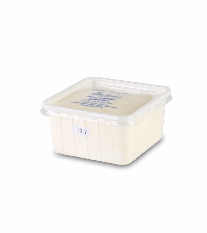 Unser Schichtkäse wird Schicht für Schicht in quadratische Formen geschöpft, bis keine Molke mehr abläuft. Anschließend wird er von Hand eingepackt.